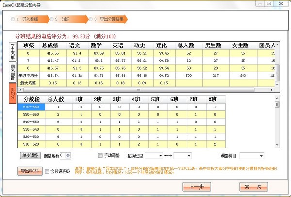 2.单科成绩、总分、男女生比例、各分数段人数均能达到完美均衡!各科均分最大差距为同类软件最小!