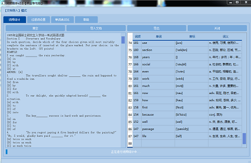 翻译,并支持导出为Excel文件。支持点击统计的单词,查看单词在文本中的分布。用背景色标注显示。支持自己添加过滤词。支持对比两个Excel文件第一列单词的异同,并导出对比情况,方便查看两分文本单词的差异。对于英语单词进行词形还原处理。避免went和gone统计程不同的单词。