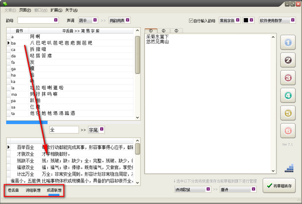 二、根据用户韵母,软件自动联想可用成语,用户可以将其加入自己的词曲中。