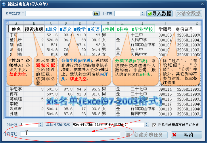 1、支持从Excel名单数据导入,分班结果EXCEL导出,数据字段智能化识别