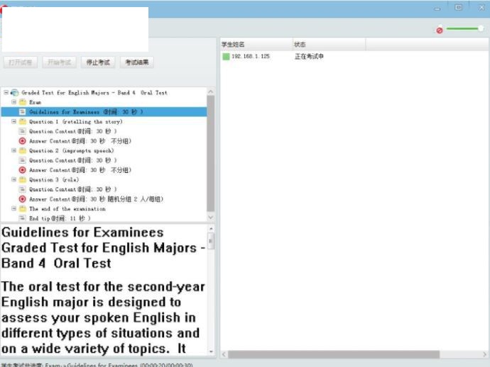 系统支持专业化口语考试功能,着重优化大规模口语考试时的网络传输性能,确保考试及录音提交快速准确;具有试音、验证到考试一整套标准化口语考试流程;考试和录音提交过程完全自动化,自动进行数字化双轨录音,以MP3格式压缩,确保音质清晰且占用空间小,满足各类标准化口语考试的需求。