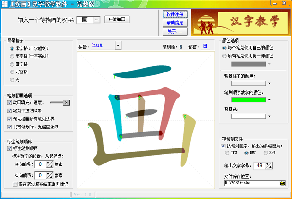 “汉画”可动态展示一个汉字的笔顺顺序,同时可以标注每一个笔划的顺序,还可以对每一个笔划使用不同的颜色输出,实现“多彩汉字”的绚丽效果