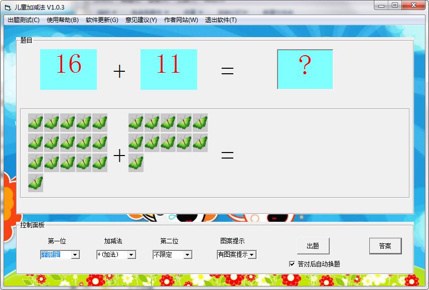 3.点击“答案”按钮,会显示计算结果,并取消“答对后自动换题”选项,待孩子学会题目后点击“出题”继续下一题。