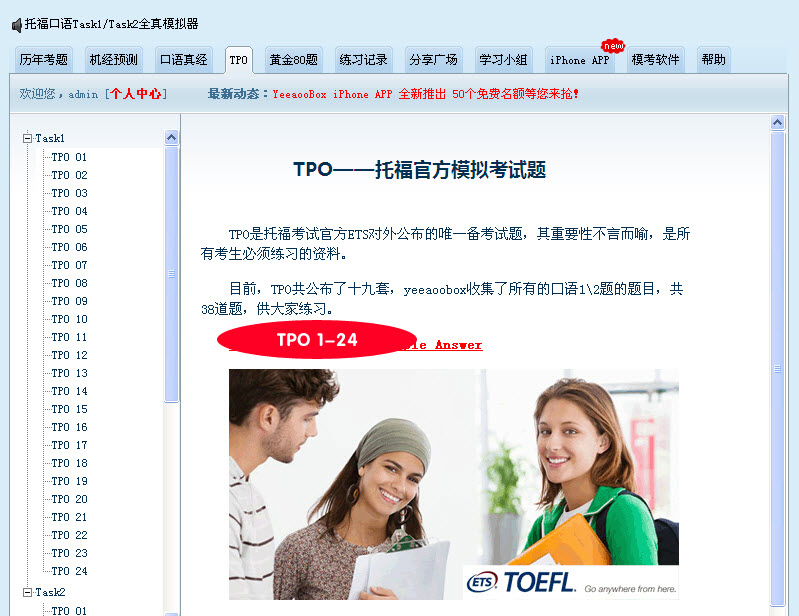 1、历年考题:所有托福口语考题实时更新。