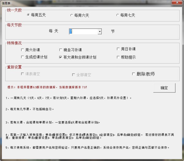 7、可安排合班和大课上课(即:两个班在一个教室上课和在一个教室上课时间是连续2节课),可以是均匀的,也可是不均匀的。
