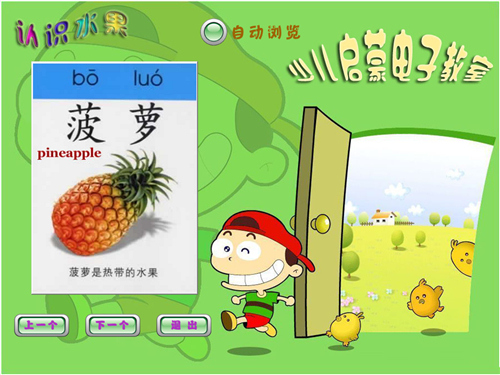 功能介绍: 大版块可分为:看图识物、语文学习,数学学习、英语学习,经典诵读,智力开发,娱乐综合。 各个大版块又可以再分为许多的子版块,内容多而全,每个版块都是我们精心制作而成,智力开发版块可以有效的提高您的孩子的智力水平,让您的孩子比别的孩子成才更快,更早。 一.看图识物版块包括:认识形状、认识颜色、认识动物、认识鸟虫、认识水果、认识蔬菜、认识交通工具、认识人物。 1.认识形状----让少儿认识常见的形状(正方形,三角形,圆形,椭园形....)。 2.认识颜色----让少儿认识常见的颜色(黑白蓝红紫....)。 3.认识动物----列出了常见的动物几十种,并配有声音,让少儿加深认识。 4.认识鸟虫----通过图片和声音让少儿认识常见的几十种昆虫和鸟类。 5.认识水果----列出了常见的几十种水果,让孩子认识它们。 6.认识蔬菜----列出了常见的一些蔬菜(青菜,萝卜,白菜.....)。 7.认识交通工具----通过声音图片让少儿认识常见的交通工具。 8.认识人物----让少儿认识常见的人际关系。 二.语文学习版块包括:初学声母、初学韵母、认识笔画、成语词典、快乐拼音、学写汉字、趣味语文。 1.初学声母----通过图片和声音让少儿学认汉语的声母,打好基础。 2.初学韵母----让少儿学认汉语的韵母,打好汉语基础。 3.认识笔画----让少儿认识常见的汉字笔画,为孩子打好汉字基础。 4.成语词典----可查询成语释义出处等,成语库现有1万多条成语可供查询,提供多种查询方式。 5.快乐拼音----声母韵母的详细讲解,在快快乐乐中轻松学会。 6.学写汉字----列出了常见的几百个汉字,让少儿从小学会识字。 7.趣味语文----本站推荐版块,多种趣味方式综合练习真正在乐趣中学习。 三.数学学习版块包括:认识数字、识别数字、加法口诀、乘法口诀、初级算数、高级算数、数学乐园、趣味数学。 1.认识数字----通过图片让少儿认识简单的数字。 2.识别数字----检查少儿的识别情况。 3.加法口诀----从1+1到9+9的口诀。 4.乘法口诀----从1×1到9×9的口诀。 5.初级算数----10以内的加减运算。 6.高级算数----100以内的加减乘除运算。 7.数学乐园----综合练习。 8.趣味数学----本站推荐版块,多种趣味方式综合练习真正在乐趣中学习。 四.英语学习版块包括:英文字母、学习音标、英语乐园、趣味英语。 1.英文字母----通过形象生动的图片让少儿认识26个英文字母。 2.学习音标----认识音标。 3.英语乐园----综合练习。 4.趣味英语----本站推荐版块,多种趣味方式综合练习真正在乐趣中学习。 五.经典诵读版块包括:学唐诗、百家姓、三字经、弟子规。 1.学唐诗----集成了几十余篇经典的唐诗。 2.百家姓----通过图文声音并茂的讲解让您的孩子牢记中国姓氏。 3.三字经----通过图文声音并茂的讲解,让少儿学会三字经。 4.弟子规----古代经典的少儿启蒙教育素材。 六.智力开发版块包括:初级拼图、高级拼图、打地鼠、连连看、少儿涂色、少儿绘画、找出不同、超级方块、趣味九宫、益智游戏。 1.初级拼图----培养孩子的形象思维能力。 2.高级拼图----培养孩子的形象思维能力(难度增强)。 3.打地鼠----培养孩子的注意反应能力。 4.连连看----培养孩子的观察思维能力。 5.少儿涂色----通过色彩的搭配,培养少儿的审美能力。 6.少儿绘画----功能齐全的少儿画板,培养少儿的思维想象能力。 7.找出不同----通过比较两幅图,培养少儿的观察能力。 8.超级方块----培养孩子的逻辑思维能力。 9.趣味九宫----培养孩子的逻辑思维能力。 10.益智游戏----收集了一些有趣的小游戏,可以培养少儿的学习兴趣。 七.娱乐综合版块包括:中文儿歌、英文儿歌、幼儿谜语、学绕口令、儿童折纸、百科故事、成语故事、经典故事、童话故事、寓言故事。 1.中文儿歌----精选多首经典的少儿中文儿歌。 2.英文儿歌----精选多首经典的少儿英文儿歌。 3.幼儿谜语----培养少儿的思维想象能力。 4.学绕口令----培养少儿的口语清晰能力。 5.儿童折纸----动画演示可折出许多有趣的小东西,让你的宝宝与众不同。 6.百科故事----从小培养宝宝对自然事物的认识。 7.成语故事----让少儿在学习的过程中学到一定的道理。 8.经典故事----经典动听的少儿儿童故事。 9.童话故事----收集了国外的一些经典的童话如安徙生童话等。 10.寓言故事----通过生动的寓言故事,让孩子明白做人的道理。