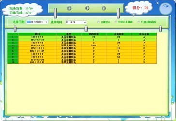 每次答题都自动统计答题结果并形成答题记录,包括题目、大题答案、正确答案和题目对错判定,并给出最后正确率、错误率、完成率以及得分,方便家长查看答题质量,查找错误