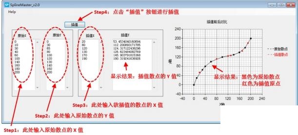??如果所用程序是SplineMaster_v2.0,点击“插值”按钮后,在程序界面右侧将绘制出原始散点和插值散点的曲线,用于直观比较插值散点偏离原始散点的程度,防止出现奇异解。曲线中,黑色曲线为原始散点曲线,红色散点为插值得到的散点。