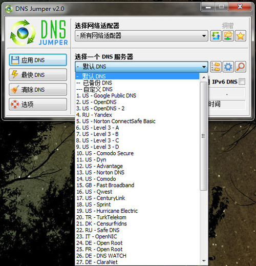 Dns Jumper(一键切换DNS) 2.0免费为贵宾多(团结友爱高朋满座)虎作伥3. 美,是有系统的,慎重谨敬的、有脉络有缘故的,丑却草率邋遢,自暴自弃。虽然有时美伪装得像后者,但其实不然,美的大自在来自“从心所欲不逾矩”的素养,而非邋遢。promote 促进;improve 改善378.心病终须心药治,解铃还是系铃人。  Dns Jumper是一款专门用于一键切换DNS的免费应用程序,里面已经包含1856. 我希望我跟你的名字能写在一起,不管是在婚礼的喜帖上,还是在葬礼的墓碑上。组DNS ,当然也包含了Google DNS,或者可以自定义添加。 经测试支持 Windows 8、Win7、Vista、XP,支持64位与32位系统,支持多网卡分别设置(譬如WIFI无线网卡以及普通的以太网网卡),提供了包含简体中文在内的多国语言。而它的使用非常简单,基本上只看上面的图你就已经知道该怎么用了吧。如果你也和我一样有换换DNS设置的需求,那么就试试它吧!相当方便实用! 当然,更改DNS的原因不止一点,选择一个适合自己的OpenDNS可以让你的上网环境更安全;可以有效阻止访问一些网站;加快网络访问速度等等,Dns Jumper 可以帮用户自动查找最快的DNS,并一键应用;支持清空DNS缓存;支持DNS分组;最新版本加入对IPv6的支持。是一款非常优秀而且免费的DNS切换软件。   软件截图2 使用方法 点击【最快DNS按钮】------选择查找-------【应用最快DNS】即可!在设置按钮选项里可以一键清除。  软件截图3 湖山经醉惯,渍春衫,啼痕酒痕无限。又客长安,叹断襟零袂,涴尘谁浣。姑苏城外寒山寺,夜半钟声到客船。Dns,Jumper(一键切换DNS),IP工具50、It is never too late to mend. |