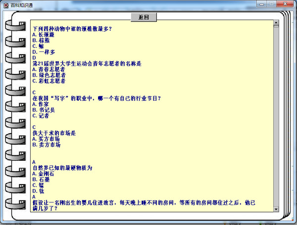 1.顺序练习:按照顺序练习“百科知识通”的所有2211道题目内容,在练习时可以同步提示您标准答案,确保您快速了解题目。
