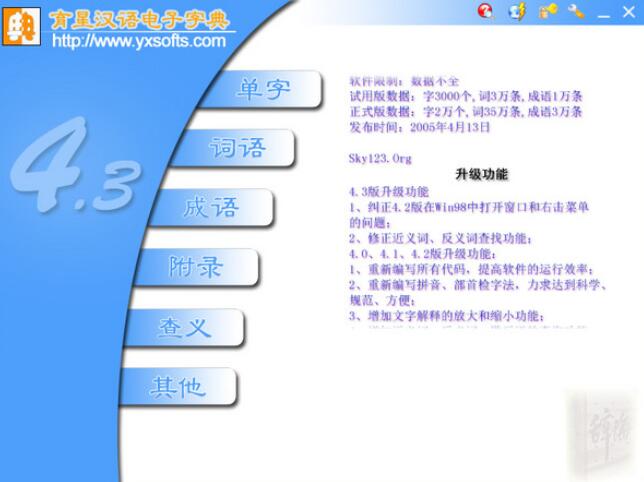 ??育星汉语电子字典包含2万余个汉字、2万余个成语、35万个词语的详细解释,总数据量约40万条,并可查询到单字的部首、笔画、笔顺、五笔字型等信息。
