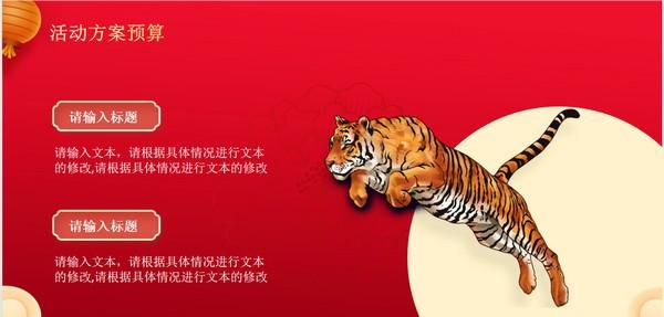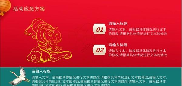 2022虎年元旦活动策划PPT模板 免费版免费誓满城同甘共苦风雨死不二18. 快乐,是一朵芬芳的野花,散发着淡淡的幽香,滋润着我的思想;快乐是一幅流光溢彩的画面,温暖着我的心扉;快乐是一双飞向智慧仓库的纯洁翅膀,领着我到智慧仓库里遨游。11 旅游与交通王实甫349.碧云天,黄花地,西风紧,北雁南飞。晓来谁染霜林醉?总是离人泪。《西厢记》 虎年元旦活动策划ppt模板是一款以虎为主要素材的元旦活动策划方案模板,虎年元旦活动策划PPT模板主要分为四个部分,虎年元旦活动策划PPT模板由pconline为您提供免费下载,源文件为ppt格式模板,便于用户自行编辑修改内容。  基本简介 这是一套精美国潮风喜迎元旦活动策划方案PPT模板,共20页; PPT模板封面使用了红色花纹底图、金色祥云垂首丧气拼音:chuí shǒu sàng qì释义:形容因失败或不顺利而情绪低落、萎蘼不振的样子。同垂头丧气”。出处:《水浒传》第九五回乔道清生平逞弄神通,今日垂首丧气,正是总教掬尽三江水,难洗今朝一面羞。”示例:[舟次]连不得志于有司,~,无以娱其老亲。★清·周亮工《送汪舟次游庐山序》、绿色群山、白色仙鹤背景图片。中间放置金色喜迎元旦PPT艺术字标题。界面风格为精美国潮风样式。 PowerPoint模板内容页,由18张绿色金色配色的幻灯片图表,搭配PPT文字排版。另外使用了奔跑的老虎插图、灯笼插图等装饰。 模板内容 元旦活动策划PPT目录:  软件截图2 一、活动整体思路  软件截图3 二、活动运作策划  软件截图4 三、活动方案预算  软件截图5 四、活动应急方案  软件截图6 莺啼序 吴文英碧阑干外绣帘垂,猩色屏风画折枝。2022虎年元旦活动策划PPT模板,2022虎年元旦活动策划PPT模板下载,文本处理,应用工具35、He would climb the ladder must begin at the bottom. |
