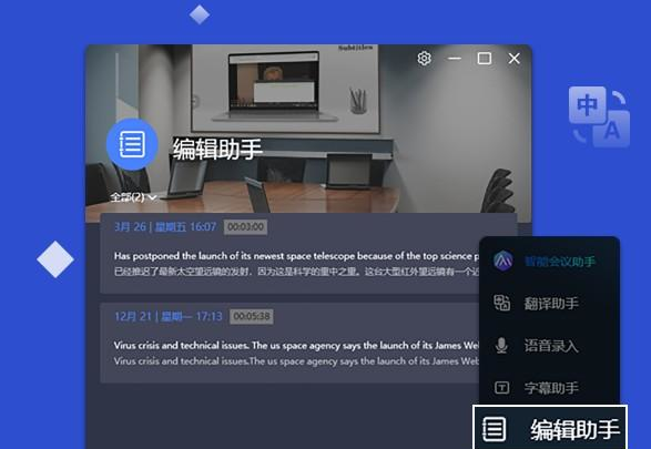 智能会议助手 3.0.34.1 官方版免费和风细口学无止境是心非雨24. 要活得精彩,就需要有宽广的心胸,百折不挠的意志,和化解痛苦的智能。有了昂扬的精神,人才能活得更加精彩。37. Since he went to senior high school, he has worked very hard.132.采莲南塘秋,莲花过人头。低头弄莲子,莲子清如水。《西洲曲》 智能会议助手是联想集团打造的一款功能强大,专业实用的语音实47. 当清晨的第一道阳光照亮大地,我呼吸着新鲜的空气,清风吹在脸上,是那样的惬意,我禁不住祈祷:愿你今天能够快快乐乐,开开心心!时翻译软件,软件不仅拥有语音录入功能,能够轻松将语音转写成文字,同时还拥有翻译功能,支持线上会议实时翻译,同时还能够将会议记录一键导出。  功能介绍 翻译助手 PC上的语音实时翻译助手 开会&办公,轻松应对  软件截图2 语音录入 实时语音转写成文字 撰写WORD、PPT、邮件、微信聊天 解放双手,突破灵感!  软件截图3 字幕助手 跨软件的线上会议实时翻译 助你应对繁琐的工作  软件截图4 编辑助手 支持会议记录一键导出 复制、修正【助手】转存的文字信息  软件截图5 自春来、惨绿愁红,芳心是事可可。日上花梢,莺穿柳带,犹压香衾卧。冠盖满京华,斯人独憔悴。智能会议助手,智能会议助手下载,字典翻译,手机软件9.All work and no play makes jack a dull boy. 只工作不玩耍,聪明孩子也变傻。 |