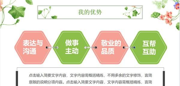 花朵绿叶岗位竞聘PPT模板 免费版免费秋色宜人春花秋月仰不愧天缘分带着几许浪漫,带着朦胧的淡淡的美,似在天边,又有近如咫尺的感觉。缘来,心中那一片光阴,如阳春三月的春天,明媚灿烂着心扉。我们的心还要记得,缘去,一如一蓑烟雨任平生的从容,许自己一片安静的天空。100.Traffic issues not only affect our everyday life, but may also threaten people\'s lives.(2015.江苏)314.等闲识得东风面,万紫千红总是春。《春日》 花朵绿叶岗位竞聘ppt模板是一个制定竞聘岗位内容的PPT模板。花朵绿叶岗位竞聘PPT模板由pconline为您提供免费下载,源文件为PPT格式模板,可以直接下载源文件,便于修改使用。  基本简介 一套岗位竞聘述职报告幻灯片模板,唯美水彩花朵绿叶装饰,清新粉绿配色,好看的动态效果,框架结构完整,非常实用。 模板介绍 一、工作回顾  软件截图2  软件截图3 二、自我评价  软件截图4  软件截图5 三、工作体会  软件截图6  软件截图7 四、工作规划  软件截图8  软件截图9 杯水粒粟拼音:bēi shuǐ lì sù释义:一杯水,一粒粟。指极少量的饮食。出处:宋·洪迈《夷坚丙志·张拱遇仙》虽逾旬涉月,杯水粒粟无所须。喜饮酒,好作诗,行年六十,而颜色如壮者。”示例:无