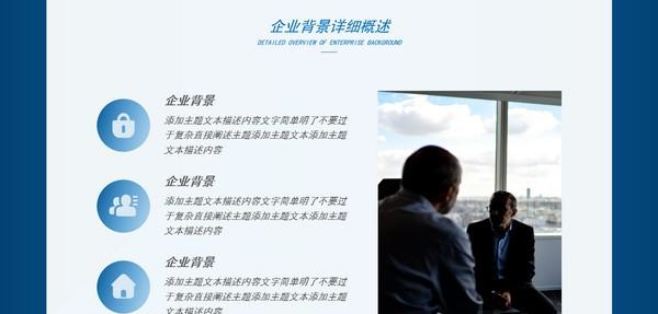 渐变商务风企业宣传PPT模板 免费版免费故弄玄彩霞心慌意乱缤纷虚7. 人生的路途漫长又曲折,在前行的路上我们也许会迷失了方向,也许会沉迷于路景,很多的迷雾和错误的路标会误导我们,让我们无法前行甚至使我们朝相反的方向前进,此时,我们只有找到自己的位置,才能一步步地接近目标,接近成功。因此,应该制定规则并严格遵守。陶渊明123.盛年不重来,一日难再晨。及时当勉励,岁月不待人。《杂诗》 渐变商务风企业宣传ppt模板是一个用来介绍企业背景、发展历程、规章制度的PPT模板。渐变商务风企业宣传PPT模板由pconline为您提供免费下载,源文件为PPT格式模板,大家可以直接下载源文件,以便于修改内容。  模板内容 1、企业背景详细概述 2、企业发展历程介绍 3、规章制度员工福利 4、企业未来发展愿景 模板预览  软件截图2  软件截图3  软件截图4  软件截图5  软件截图6 3. 曾经以为过不去的,终究会过去。痛苦有时候是一种提升,否则,我们流的眼泪也就毫无意义。