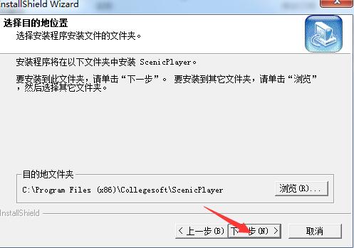 7、该向导框将完成ScenicPlayer软件安装路径的设置。默认的安装路径为:X:Program FilesCollegeSoftScenicPlayer。接受默认设置点击按钮“下一步”将进行文件安装。