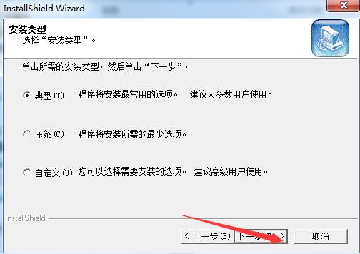 6、该向导框通过三个单选按钮要求用户选择一种安装类型,如果选择典型则程序将安装最常用的选项,一般为推荐选项;如选择压缩则程序将安装所需的最少选项;自定义选项则是为高级用户所设计的;在本使用手册中我们向用户介绍是选择典型后的安装。在选择典型后单击“下一步”按钮,弹出如下图所示的向导框:
