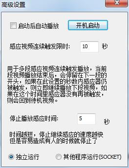 一般选择独立运行,选择其他程序运行代表一旦出现感应,由本程序通过接口将需要播放的视频路径告知给其他程序,此选项需要和购买者对接