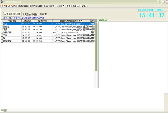 2.定时开机(须主板支持)、定时播放音乐、定时关机;控制开始播音时间和结束播音时间;通过设定每天的时间表来控制播音,实现自动化播音;可以试播,可以插播;可以定时,支持网络收音机,网络广播电台等。