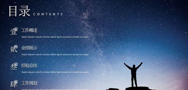 星空大气年终总结汇报PPT模板 免费版免费万木葱手无缚鸡之力茏鸦雀无声38. 倘若期望在金色的秋天收获果实,那么在寒意侵人的早春,就该卷起裤腿,去不懈地拓荒播种耕耘,直到收获的那一天。33. 对…有益 be beneficial / conducive to…杂家372.风声雨声读书声声声入耳,家事国事天下事事事关心。(顾宪成题东林书院门前对联) 星空大气年终总结汇报ppt模板是一款以星空为背景的年终总结,总结汇报PPT模板,星空大气年终总结汇报PPT模板由pconline为您提供免费下载,更多免费PPT模板请关注pconline模板网。  模板内容 1、工作概述 2、业绩展示 3、经验总结 4、工作规划 模板预览  软件截图2  软件截图3  软件截图4  软件截图5  软件截图6  软件截图7  软件截图8  软件截图9