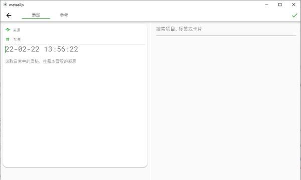 metaslip(元思笔记) 1.0.4 官方PC版免费万盲人稳如泰山摸象紫千红1. 在人生征途中有许多弯路小路险路暗路,只有意志坚定且永不停步的人,才有希望到达胜利的远方。65. High school students are faced with a choice between arts and science.(2012.安徽)306.夜阑卧听风吹雨,铁马冰河入梦来。《十一月四日风雨大作》 metaslip(元思笔记)是一款非常方便的笔记软件,可以创建多种格式类型,随时随地都可以更加方便的记录,功能强大,界面简洁,操作简单,需要的朋友快来下载吧。  软件特色 高度类似卡片笔记。 从元思笔记整个页面布局来看,其实是最接近卢曼卡片笔记的一款软件。因为在软件的开发者也直言:“......经过一番查找,发现手机端并没有比较好的对应软件,就想着能不能自己开发一款......” 关于卡片笔记翠竹黄花拼音:cuì zhú huáng huā释义:指眼前境物。出处:宋·释道原《景德传灯录·慧海禅师》迷人不知法身无象,应物现形,遂唤青青翠竹,总是法身;郁郁黄华,无非般若。黄华若是般若,般若即同无情;翠竹若是法身,法身即同草木。”示例:无的应用很多,大名鼎鼎的roam research, obsidian, remnote以及最近在国内兴起的flomo。(此款软件被印象笔记抄袭,取名为印象轻记。这里不忘踩一下) roam research和remnote采用的是节点状的笔记结构,obsidian(现在有手机版本了,但是同步的问题还没解决)则是以文档的形式保存,flomo做的最像卡片笔记,但是它还是可以插入图片。而在元思笔记中,你只能输入文字,并且做一些简单的编排。 这个特点仁者见仁。有些人会觉得这是优点,没有花里胡哨的功能,专注于文字和思想本身,更何况卢曼的卡片笔记也是无法插入图片的。但有些人也认为,在如今这个笔记软件纷繁复杂的时代,图片的插入是刚需。 webdav云备份 元思笔记提供本地存储,不提供云服务器,但是它支持你使用webdav对你的不同设备之间的笔记进行云备份、云恢复。说到这个webdav,那就不得不说国内最火的支持webdav的网盘软件--坚果云。我使用的就是webdav对我的笔记进行跨设备的同步,元思笔记和坚果云联合使用很流畅,同步速度也很快。 没有块引用的烦恼 其实这一个特点,并不是针对元思笔记来说的,而是我在使用完其他双向链笔记之后的感受。我在上面提到的很多软件,roam research、remnote、obsidian,还有noiton、wolai等,都有或者需要一个块引用。因为这些软件,它们的页面能装下的东西实在太多了,如果你没有块引用的概念的话,每次引用只能使用页面引用。但是你的页面里面装的东西又很多,每次需要找到你想要引用的那一块儿就非常麻烦。 对于rr、rn、notion这些软件,他们本身用的就是节点式笔记或块状笔记,想要解决就简单很多,但是对于obsidian这样的软件来说,想要实现块引用就不好办了。有一个人为的办法就是,把obsidian的每一个文档里面的内容减少,变成一张一张卡片,就可以实现“伪块引用”。 在元思笔记里面,你根本就不用考虑这一点,开发者把内容添加页面直接设置成卡片的样式,在这样一个创作环境里面,你压根儿就不会想要多写,而是想着我该怎么样去粗取精或者与其他卡片建立联系。 这是个人认为非常棒的一点,卡片笔记越来越像卡片了。  软件截图2 候馆梅残,溪桥柳细,草薰风暖摇征辔。离愁渐远渐无穷,迢迢不断如春水。自从弃置便衰朽,世事蹉跎成白首。metaslip(元思笔记),metaslip(元思笔记)下载,文本处理,应用工具31、Walls have ears. |