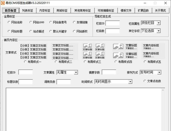 易优CMS标签生成器 3.3 绿色版免费寒冬腊月未雨鸟语花香绸缪6. 瞩目远方,你才会加快步伐;观赏风景,你才会步履轻盈;结伴同行,你才能欢歌笑语;风雨兼程,你才能成功登顶。14.就…达到绝对的一致 reach an absolute consensus on…杜甫179.穷年忧黎元,叹息肠内热。《自京赴奉先县咏怀五百字》 易优CMS标签生成器是一个CMS标签生成工具,软件绿色免费,界面清晰简单,能帮助用户快速简单生成标签,支持生成列表标签、内容标签、商城标签等,操作简便,使用简单。   软件截图2 功能介绍 1、首页标签 2、列表标签 3、内容标签 4、商城标签 5、其他常用标签 6、可视编辑标签 7、模板文件,扩展函数