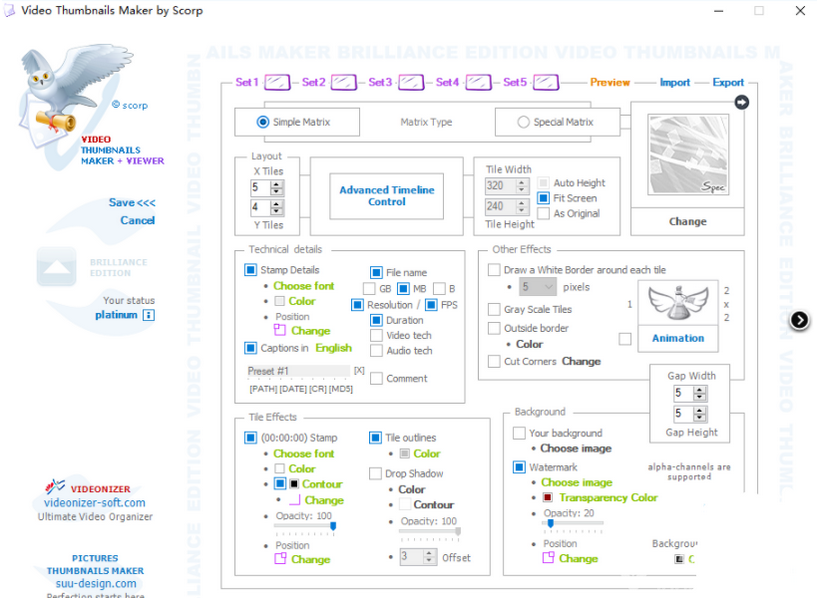 Video Thumbnails Maker Platinum中文版是一款特色便捷、专业高端实用的视频缩略图生成工具。Video Thumbnails Maker Platinum中文版功能就是可以制作视频的缩略图。这款软件几乎支持所有的视频文件格式,而且,它还有批处理功能,有了它,用户可以制作出视频的不同格位缩略图片,并且。能够创建出动画和视频文件的屏幕截图。而且软件还有水印、适合屏幕、特殊效果、可定制的字体、拍摄时间戳等等功能,可以让用户轻松的创建缩略图。