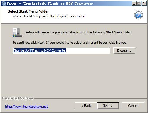 4、选择软件开始菜单文件夹名称,默认为“ThunderSoft\Flash to MOV Converter”