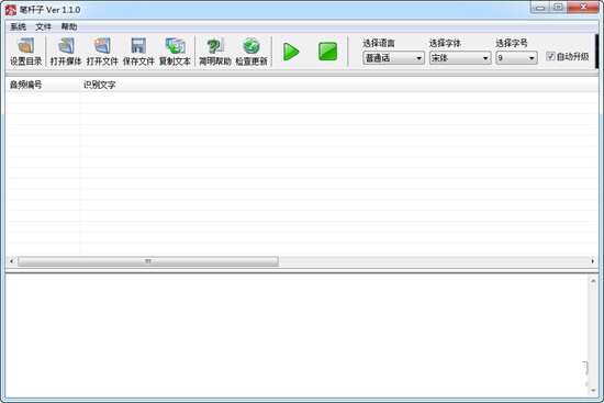 2、选择语言和设置文字及升级参数:《笔杆子》目前支持四种(含)地方性语言的翻译,默认为普通话,用户应该选择与录音相应的方言进行翻译。《笔杆子》也能对字体字号和升级参数进行设置。