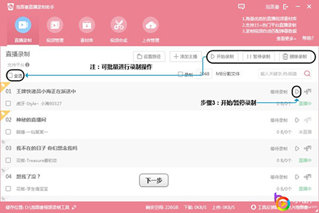 通过每个任务条单独的开始/暂停按钮控制任务进程,也可通过全选任务进行一键控制所有的录制任务。