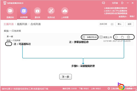 对录制视频进行剪辑上传操作,窗口会弹出视频剪辑上传界面,您可查看此视频并可通过选取视频开始时间点和结束时间点进行录制视频的剪辑,形成新的视频片段,预览后,对自己剪辑满意的视频片段,可以填入视频标题后,一键上传至泡面番短视频平台进行分享。