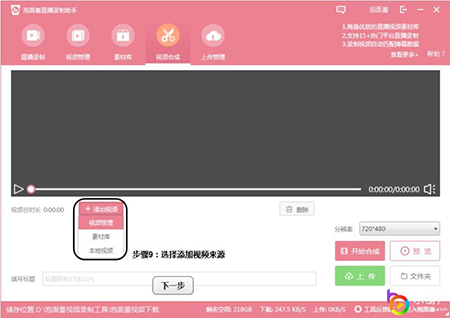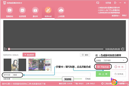填写合成视频标题,选择合成视频分辨率,点击“开始合成”按钮,视频合成成功后,可一键上传至泡面番短视频平台;合成视频可在视频管理中“合成列表”查看。