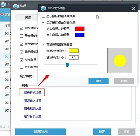 当你想要录制一些教程类视频的时候,你可能就需要记录下鼠标的一些动作演示。Apowersoft录屏王就能够帮助你顺利的录制下鼠标的一举一动。首先你需要在“录屏”设置中勾选上“包含鼠标”,然后在“高级”设置菜单下点击“鼠标样式设置”,在这里你可以设定鼠标点击动画效果的颜色、鼠标热点颜色以及大小。