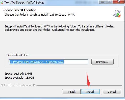 2、选择安装位置,默认的是C:\Program Files (x86)\Text To Speech WAV,如果想修改点browse,之后点击install开始安装