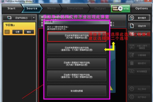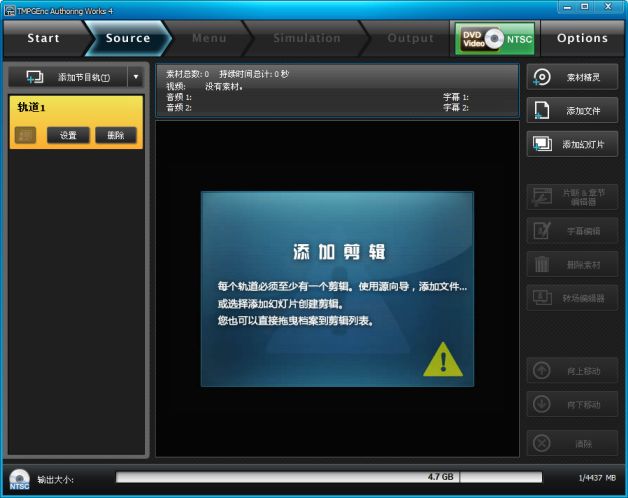 首先启动TMPGEnc Authoring Works,点击Source按钮进入素材精灵界面添加源素材。
