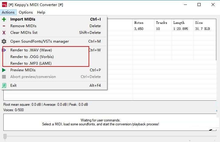 支持将MIDI文件转换为WAV、MP3或OGG等文件格式;