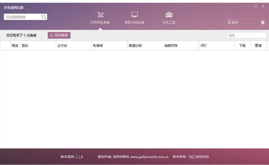 点击【同步曲谱】按钮可以同步您在吉他世界网已购买的谱子,再点击【下载】到浏览器!