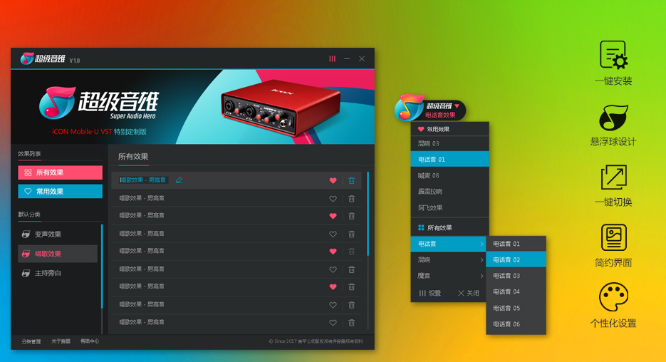 创意悬浮球窗口好玩更好用,小巧的操作界面更省空间。一键切换效果,调音小白也能信手拈来。简洁的界面,一目了然的分类方式,人性化常用音效分组设置,寻找音效不再大海捞针。
