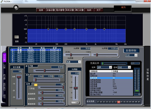 12、话筒高低音五段参量均衡,主输出五段参量均衡,主输出音量调节,主输出直达声、效果声调节,总音量调节。