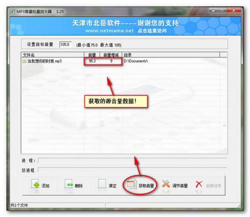 1、添加一个音乐文件,先点击【获取音量】按钮,看看源文件的音量数据,然后,点击【调节音量】按钮,就OK了!