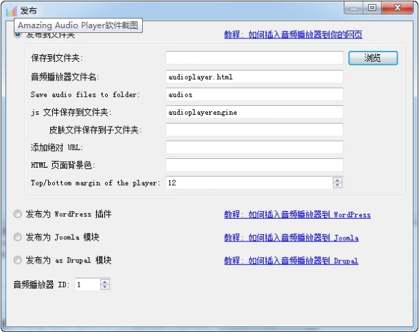 Amazing Audio Player最新版是一款上手非常容易操作的且能够帮助用户快速制作出一个HTML5音频播放器的小工具,使您能够为您的网站创建HTML5音频播放器,做好的播放器可以作为插件整合到Wordpress博客系统中,Amazing Audio Player最新版用户只需将需要播放的音乐添加到软件中,然后选择皮肤即可。