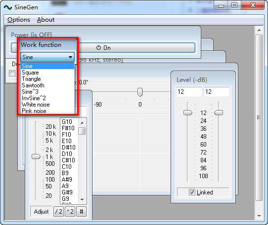 ??3、下图中显示的各类参数可对SineGen进行调节,点击“power”按钮(图中④)位置即可测试效果