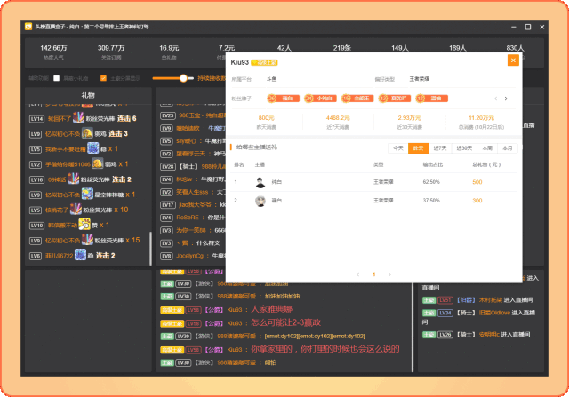 头榜直播盒子窗口模式更像是直播间的监控台,实时掌握直播间的各项数据,土豪数据分屏显示,不容易错过土豪弹幕和礼物答谢,高等级贵族拥有高级弹幕,实时醒目播报,给土豪也给你更高级的体验~