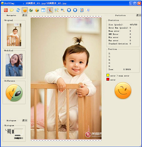 照片相似度对比软件绿色版是一款免费的图片比较软件,通过软件算法的自动分析,它能够让你快速的知道两张类似图片的所有不同之处。所以DiffImg用来作为大家来找茬游戏的外挂或者辅助工具最合适不过了,今后肯定能够百战百胜,难度在高,图片中的不同之处也逃不过你的法眼,也无需因此消耗多少脑细胞和眼力了。