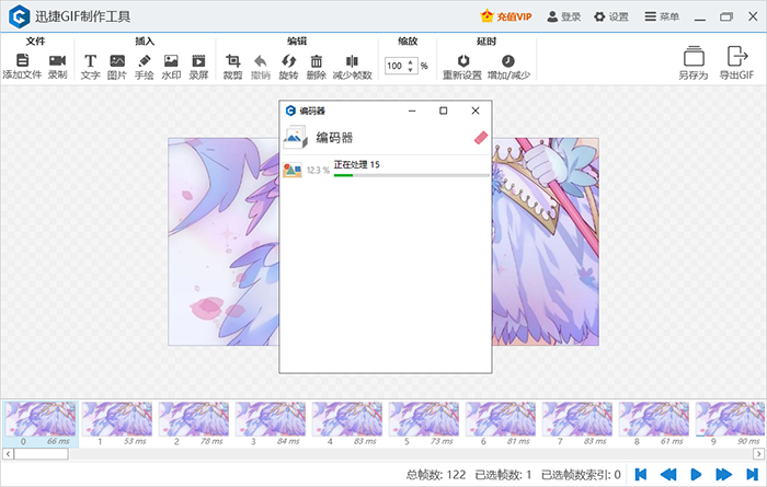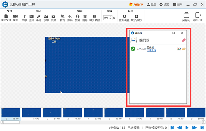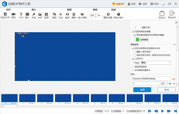 3、然后在编辑器中设置各种输出GIF文件的参数,例如:添加文字、图片、手绘、水印或者是裁剪、旋转、减少帧数等,这些参数都可以适当减少输出文件GIF的大小,但也能保持更好的体验。