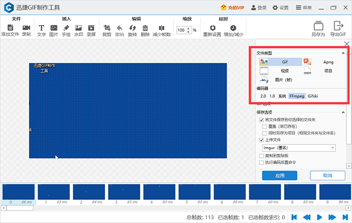 4、然后就可以准备导出GIF图片了。点击编辑器右上角的导出GIF,然后选择Gif文件类型导出,至于编辑器可以选择默认的1.0当然也能选择FFmpeg导出。如果是直接导出视频或者图片帧都是可以选择导出的。