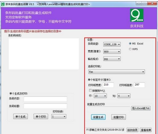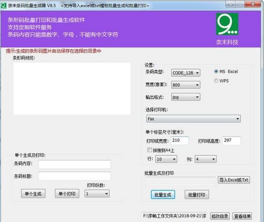 备注:Excel模板第一列是条码内容-必填项,第二列是生成图片文件名-必填项,第三列是选填项,是条码备注;TXT模板,一行是一个条码