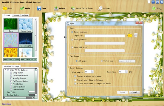如果要设置高级选项,如将背景音乐添加到输出动画书、添加翻页声音以使翻页效果更真实、隐藏一些按钮或更改翻页间隔,可以单击“高级设置”面板上的按钮。