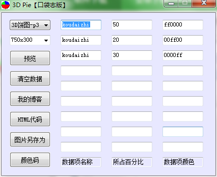 3D-Pie官方版是一款操作简单的轻量级饼状图制作软件。3D-Pie官方版利用Google图表来生成3维或2维,生成的饼状图可以导出为高清的PNG图片,也可以生成HTML代码(调用Google饼状图工具)直接嵌入网页。3D-Pie(轻量级饼状图制作软件)官方版支持制作3D饼图和2D饼图。