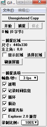 使用方法异常简单,设置一下捕捉区域大小位置,即可开始捕捉。当然为了效果,你可以把帧数/秒提高,另外还可以设置是否捕捉鼠标,描边,循环播放,透明等。